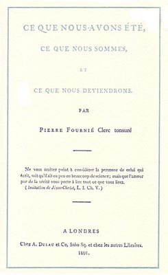 Élu coën, secrétaire de Martines de Pasqually, il assumera, après son décès (1774 à Saint-Domingue) l’éducation d’un de ses fils. Il a écrit un seul ouvrage, publié en 1801 à Londres où il s’est réfugié lors de la Révolution et où il est décédé en 1825 : Ce que nous avons été, ce que nous sommes, et ce que nous deviendrons. Pierre Fournié est l’un des premiers acteurs du martinisme au XVIIIe siècle et une figure incontournable du mysticisme chrétien. Pour en savoir plus - Faivre Antoine. « Un martinésiste catholique » : l’abbé Pierre Fournié : 1er article. Revue de l’histoire des religions, tome 172, n°1, 1967. pp. 33-73. - Robert Amadou, « L’Abbé Fournié ». Revue L’Initiation, n°4, 1966, pp.218-237. |