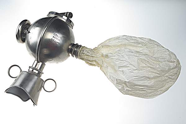 Fig. 114 : Masque à éther d'Ombrédanne (L. 38 x 19 cm 1908) premier appareil permettant le contrôle de la quantité d'éther administré à chaque inspiration.