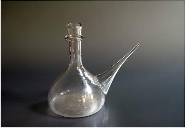 Fig 4 : Biberon en verre dit "Porron" (H. 12 cm XVIIIe siècle). Bouteille à long bec conique latéral et haut goulot. Verre soufflé conservant la marque du souffleur à sa base. C'est une sorte de gourde comme on en trouve encore en Espagne pour boire le vin à la régalade. Autour du bec on enroulait un chiffon dit "drapeau" que le bébé têtait ; on ne le changeait pas souvent, il se chargeait de bactéries. les diarrhées ou dysenterie pouvaientêtre mortelles.