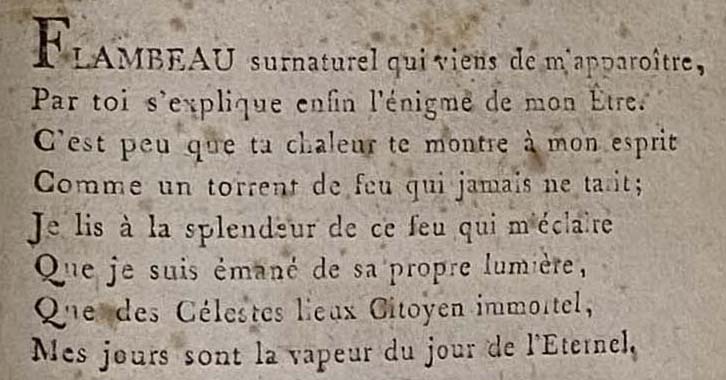 Cette ode enchanteresse et consolatrice, est de la composition du F∴ de Saint-Martin, que la mort a saisi inopinément depuis deux ans. Il avait été admis, en 1769, par l’un des membres zélés du G∴ O∴ de France, aux mystères de notre Ordre, et s’en était tellement pénétré, qu’à l’instant même qu’il a connu les véritables grades supérieurs qu’il a été à portée d’en démêler les rapports directs, et étroitement liés avec nos grades symboliques, il s’est exclusivement livré à son enthousiasme, a quitté le service, il y touchait au grade de capitaine dans un régiment d’infanterie, et le fruit qu’il a recueilli de ses travaux Maçonniques a produit plusieurs ouvrages trop peu connus, et encore moins faciles à comprendre, à moins qu’on ne soit initié dans les mêmes mystères. [page 362]