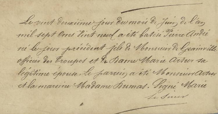Le vint [sic] deuxième jour du mois de juin de l’an mil sept cent vint [sic] neuf a été baptisé Pierre André né le jour précédent fils de Monsieur de Grainville, officier des Troupes et de dame Marie Artur sa légitime épouse. Le parrein [sic] a été Monsieur Artur et la mareine [sic] Madame Dumas. Signé Marie.