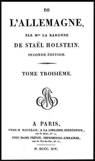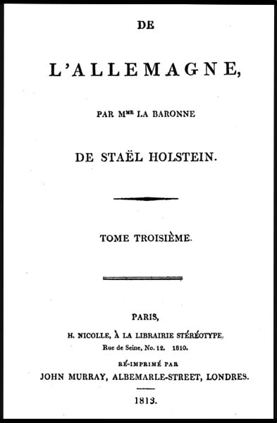 - Mme de Staël, De l'Allemagne, T. 3, seconde édition