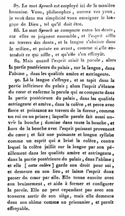 (1) Voici un exemple des analogies de Boehm. — « Le mot Sprach est employé ici de la manière humaine. Vous, philosophes, ouvrez vos yeux, je veux dans ma simplicité vous enseigner le langage de Dieu tel qu'il doit être. — Le mot sprach se compacte entre les dents ; car elles se joignent ensemble, et l'esprit siffle à travers des dents, et la langue s'abaisse dans le milieu et pointe en avant, comme si elle entendait ce qui siffle, et qu'elle s'en effrayât. Mais quand l'esprit saisit la parole, alors il fait fermer la bouche et saisit cette parole dans la partie postérieure du palais, sur la langue, dans l'abîme, dans les qualités amère et astringente. Là la langue s'effraye et se tapit dans la partie inférieure du palais ; alors l'esprit s'élance du cœur et enferme la parole, qui se compacte dans la partie postérieure du palais, dans les qualités astringente et amère, dans la colère, et perce avec force et puissance à travers de la fureur, comme un roi ou un prince ; laquelle parole fait aussi ouvrir la bouche, domine-dans toute la bouche, et hors de la bouche avec l'esprit puissant provenant du cœur ; et fait une puissante et longue syllabe, comme un esprit qui a brisé la colère, contre lequel la colère jaillit sur la langue par son pétillement dans les qualités amère et astringente, dans la partie postérieure du palais, dans l'abîme, et elle (cette colère) garde son droit pour soi, et demeure en son lieu, et laisse l'essence douce passer du cœur par elle. Elle tonne ensuite avec son bruissement et aide à former et à configurer la parole. Elle ne peut cependant pas, avec son tonnerre, sortir de son siège, mais elle demeure dans son abîme comme un prisonnier et paraît effroyable. » Aurore naissante, tome 2, chap. XVIII, [§ 87-90, p. 109-110] trad. de Saint-Martin.