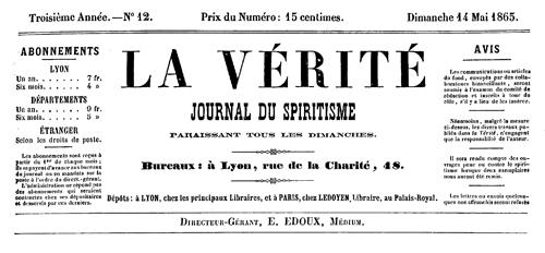 La Vérité - Journal du Spiritisme, paraissant tous les dimanches - Bureaux à Lyon, rue de la Charité, 48 - Troisième année – N° 12 – Dimanche 14 mai 1865 - Pages 46-47 - (2e article. — Voir le dernier numéro.)