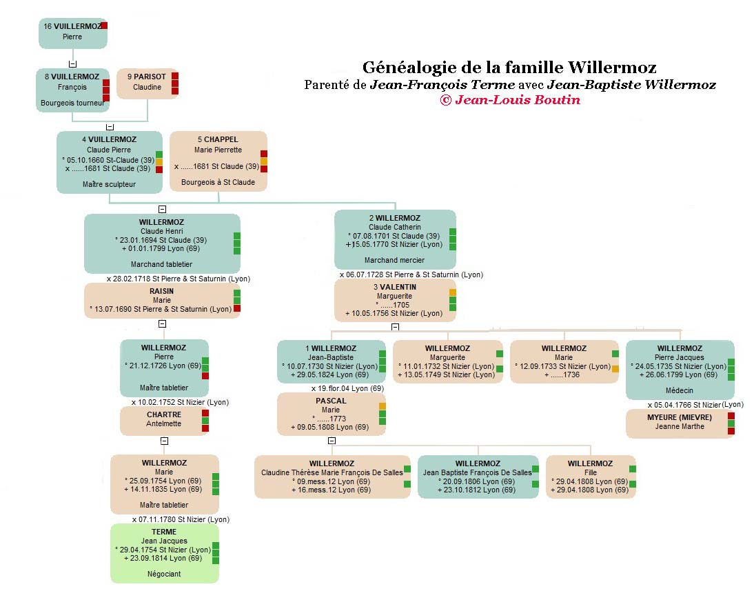 Comme on peut le voir sur ce schéma, Jean-François Terme est le petit cousin (et non le neveu) de Jean-Baptiste Willermoz.